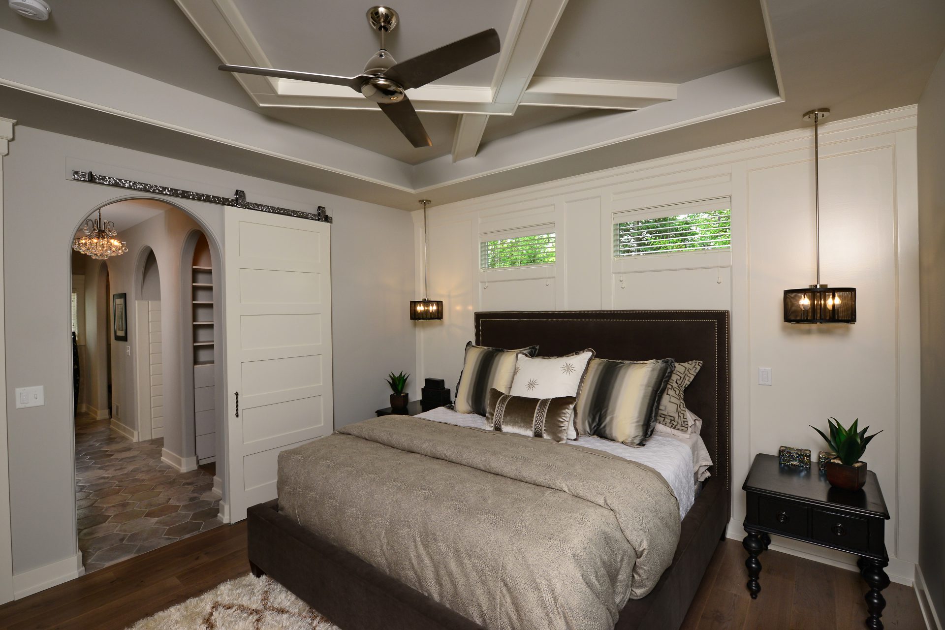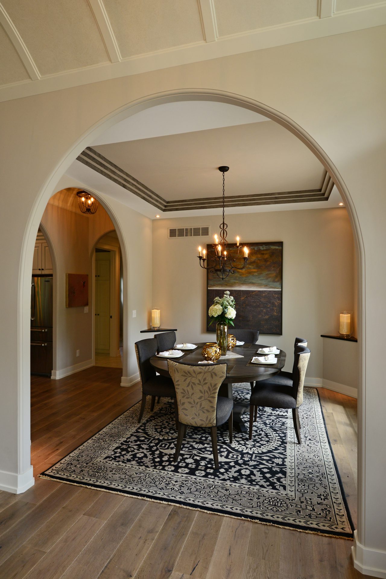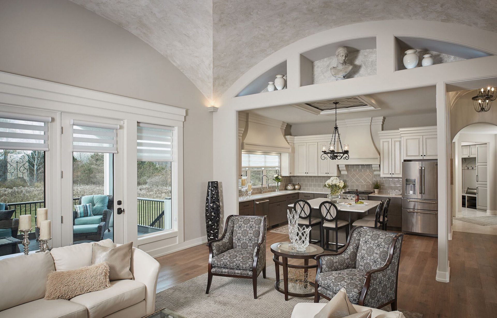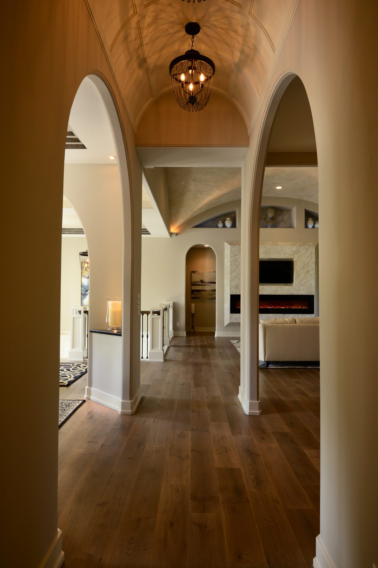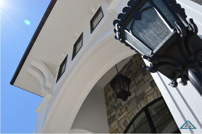 The creativity of the Dave Dusendang Custom Homes team is on full display in this unique custom home. The “Palma” plan blends Mediterranean charm with the more traditional craftsmen style. Custom features are found in every area of the home from the well thought out storage in the laundry area to the grand groin vaulted & barrel ceilings.