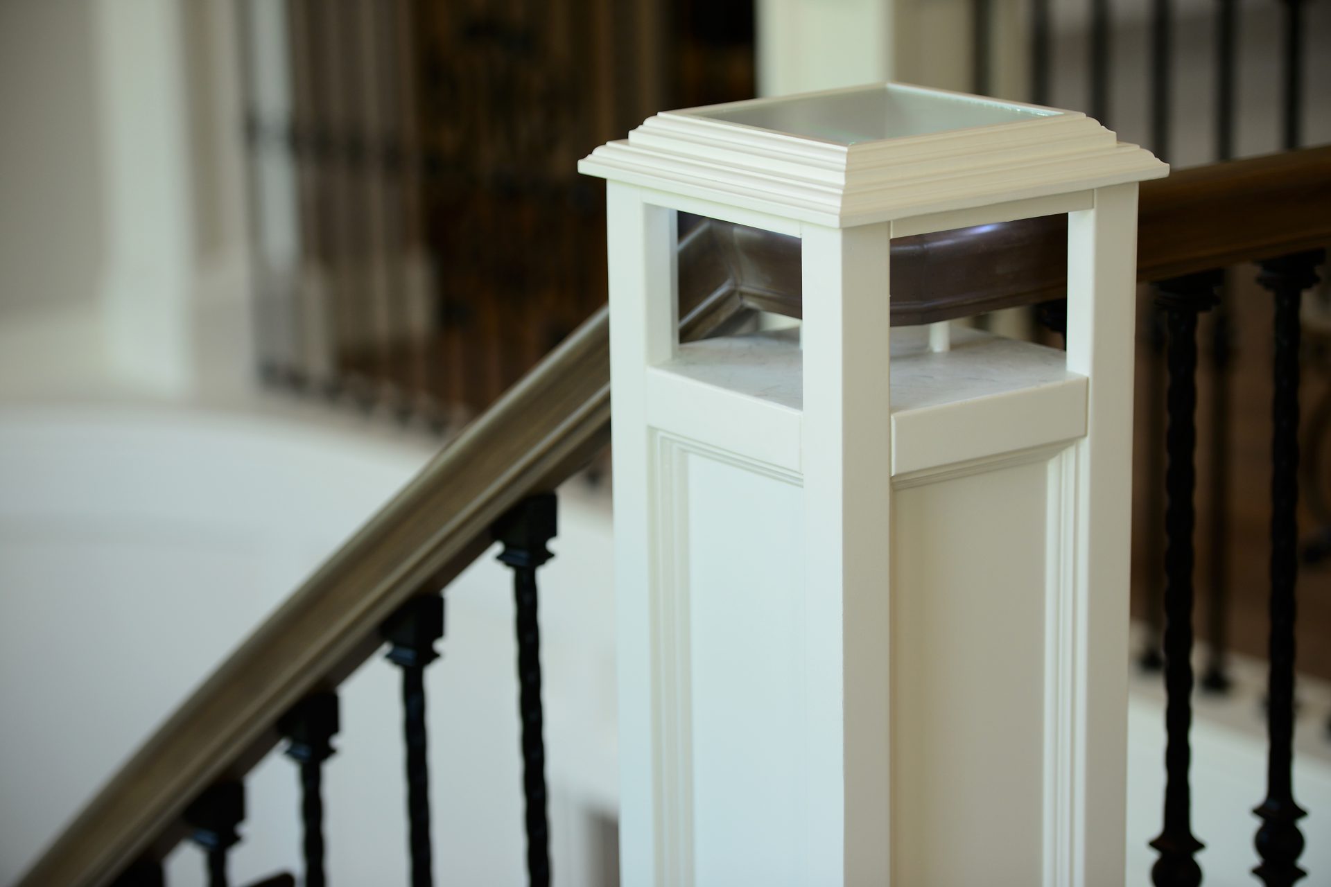 - 360 degree rounded staircase with unique newels and handrail details with LED Lighting